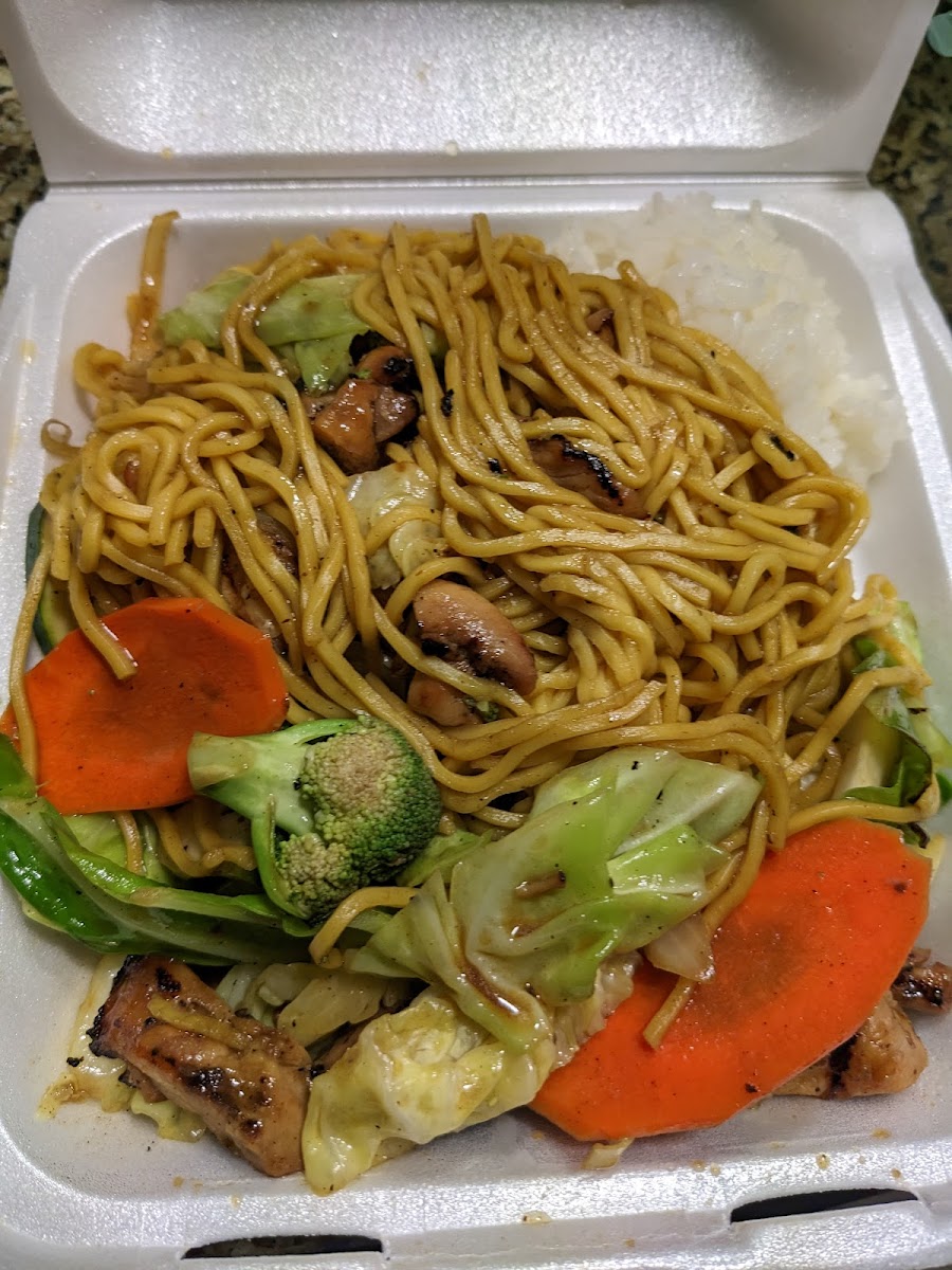 My friend and I were hungry after going to the craft fair at the hotel down the street, so we stopped here after seeing the fairly good reviews. It was not an area or place I would normally go to, but I was surprised at the good taste of the food. The place itself was plain and kind of run down. They had a few toy cars on the wall shelves and some background Christmas music playing. The water dispenser was strange and not easy to use. It was also out of water. The guy behind the counter didn’t seem super happy to be there. They had some canned drinks in the standing coolers to the side. The menu was fairly standard for a teriyaki place. The prices were $10 or more per plate. I had the garlic chicken which was very good, and my friend had the yakisoba. The chicken wasn’t super chewy/fatty and the salad seemed fresh. I would have liked less salad dressing on the salad, but I forgot to ask for it on the side. The amount of food was good for the price. I ate about 2/3 of the plate and took the rest home for my kid to eat. I also noticed they had bowls to eat for someone who may have wanted less to eat. All in all, it wasn’t a bad place, but I would not come here specifically for the food unless I was in the area and wanted something besides fast food. The stores around this place were also kind of run down and sketchy, so I would not like to be here at night.